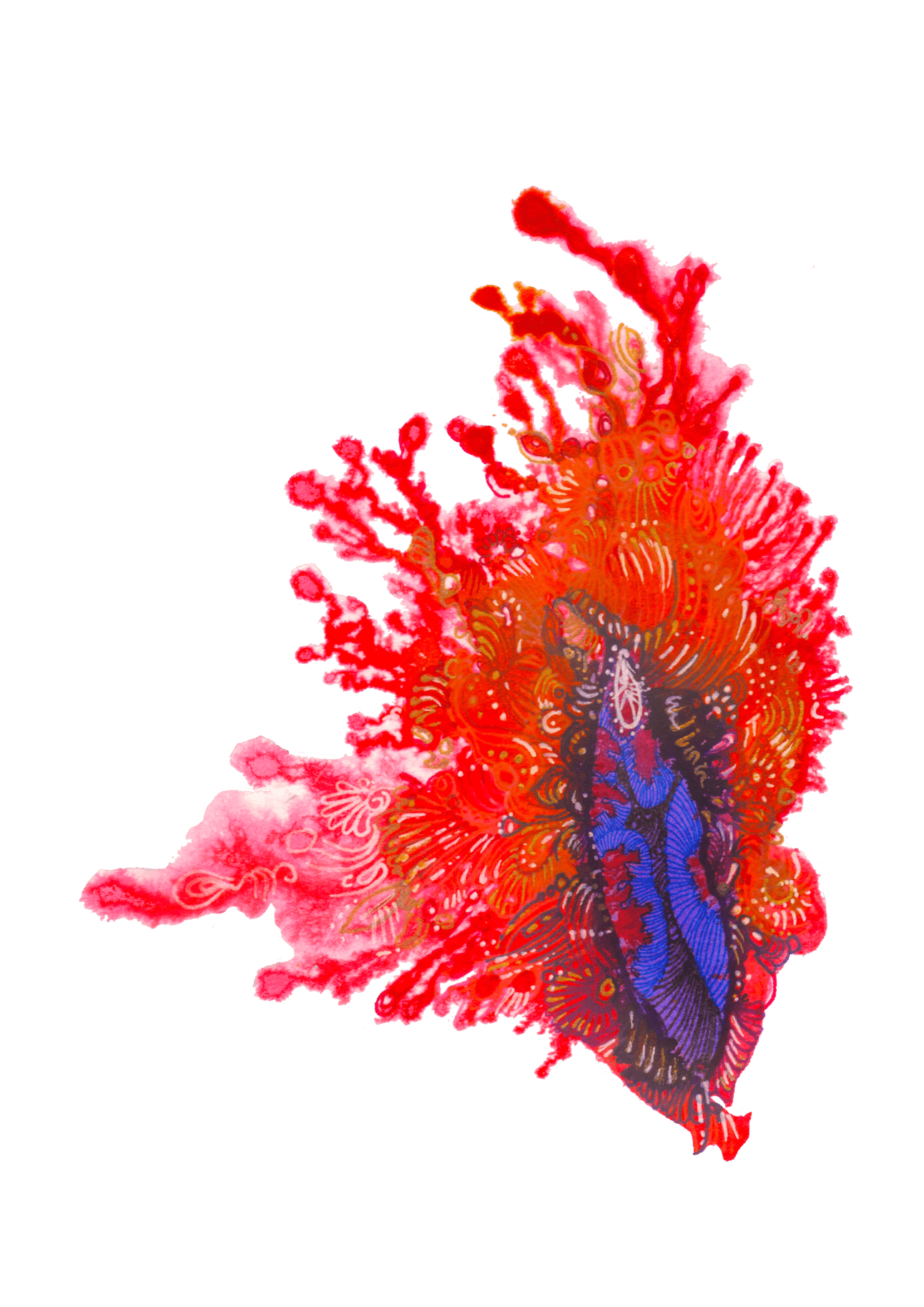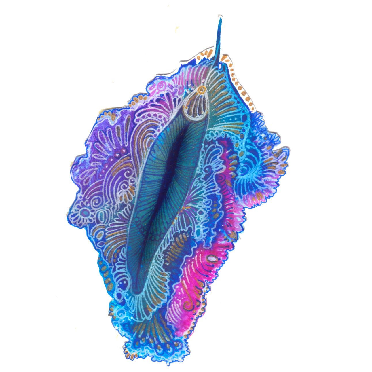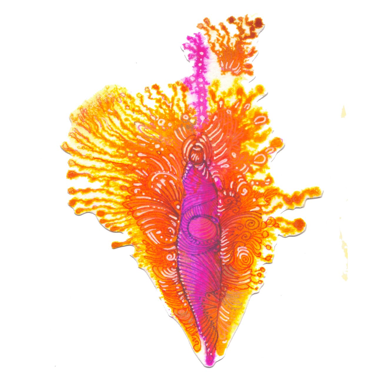 But anyway, I want to celebrate the reality and the joy of what it means both to have and enjoy female parts, and this is behind my Vaginas series. Each starts as an abstract swirl of ink blooming on wet watercolour paper, a blur and bleed together of colour, unpredictable and infinitely varied, spilling across the whiteness in pulsating magenta, brilliant yellow, fiery orange and enveloping, velvet purple, taking it over, claiming the space. I let it stand, shimmering on the paper, then start to explore with line work, swirling and and twisting through the shapes discovered, titillating the edges with nibbles of line work, decorating and tantalising with swirl and curls and pattern and curlicues, building and building, intricate and intense and glittering with hints of gold and brilliant contrast until - until - well, hopefully you get the picture.
